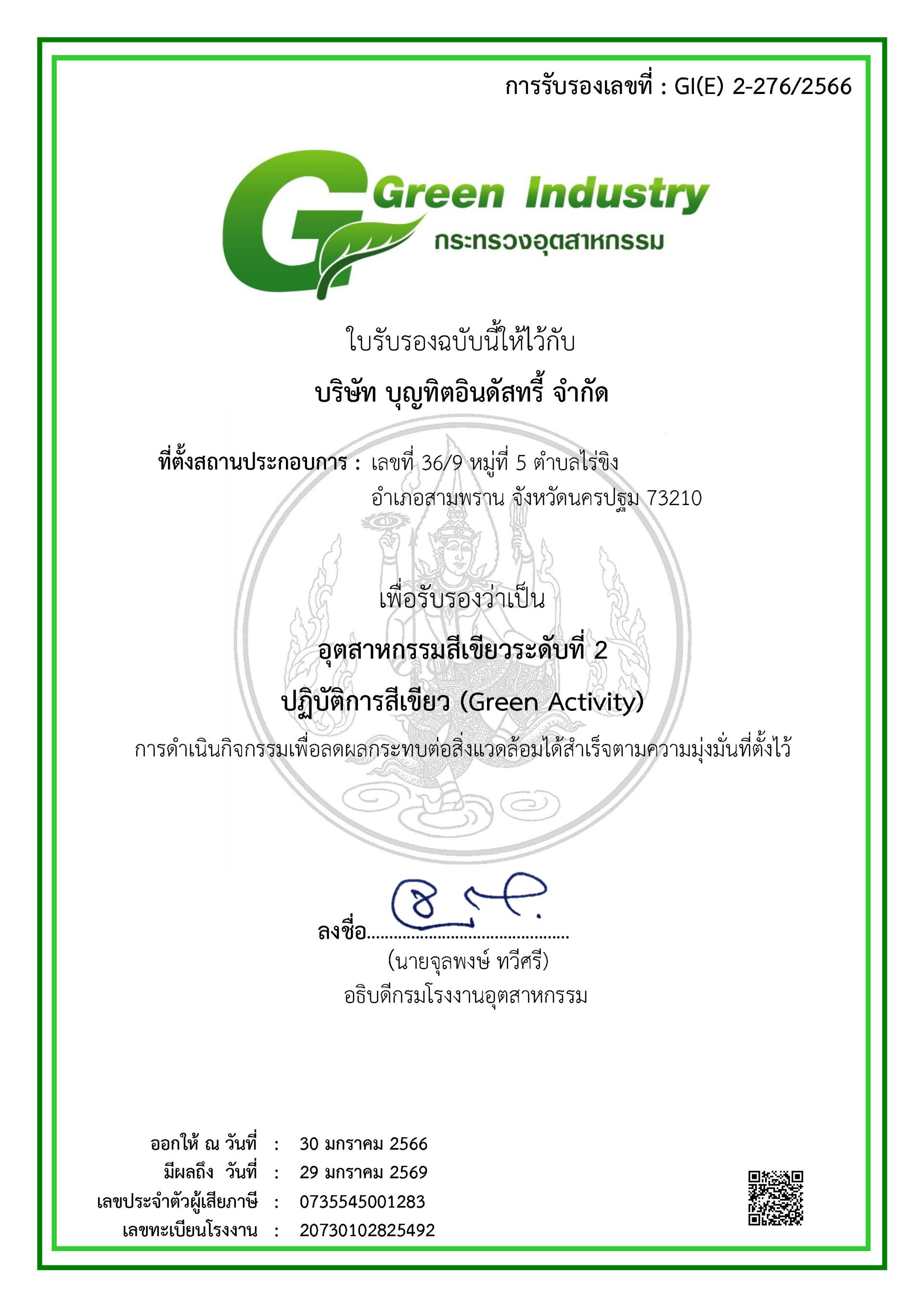 บริษัท บุญทิตอินดัสทรี้ จำกัด เดิมชื่อ บริษัท บูรณ์ทิตต์ อินดัสตรี้ จำกัด ก่อตั้งขึ้นเมื่อปี พ.ศ. 2545 ด้วยความมุ่งมั่นที่จะผลิตและจำหน่ายฟิล์มพลาสติก สำหรับใช้ในการเกษตร การเลี้ยงสัตว์น้ำ และอุตสาหกรรมทั่วไป อาทิเช่น ฟิล์มพลาสติกคลุมโรงเรือน พลาสติกปูบ่อ พลาสติกคลุมดิน พลาสติกปูพื้น และ ถุงเพาะชำ ผลิตด้วยเครื่องจักรที่มีระบบทันสมัยนำเข้าจากประเทศไต้หวัน ในปี พ.ศ. 2560 บริษัทฯ ได้เพิ่มไลน์ผลิตสินค้าในกลุ่มพลาสติกเพื่อการเกษตร อาทิเช่น เทปน้ำหยด เทปน้ำพุ่ง สายไมโคร และสายรัดโรงเรือน เพื่อตอบสนองความต้องการของลูกค้าได้อย่างสมบูรณ์